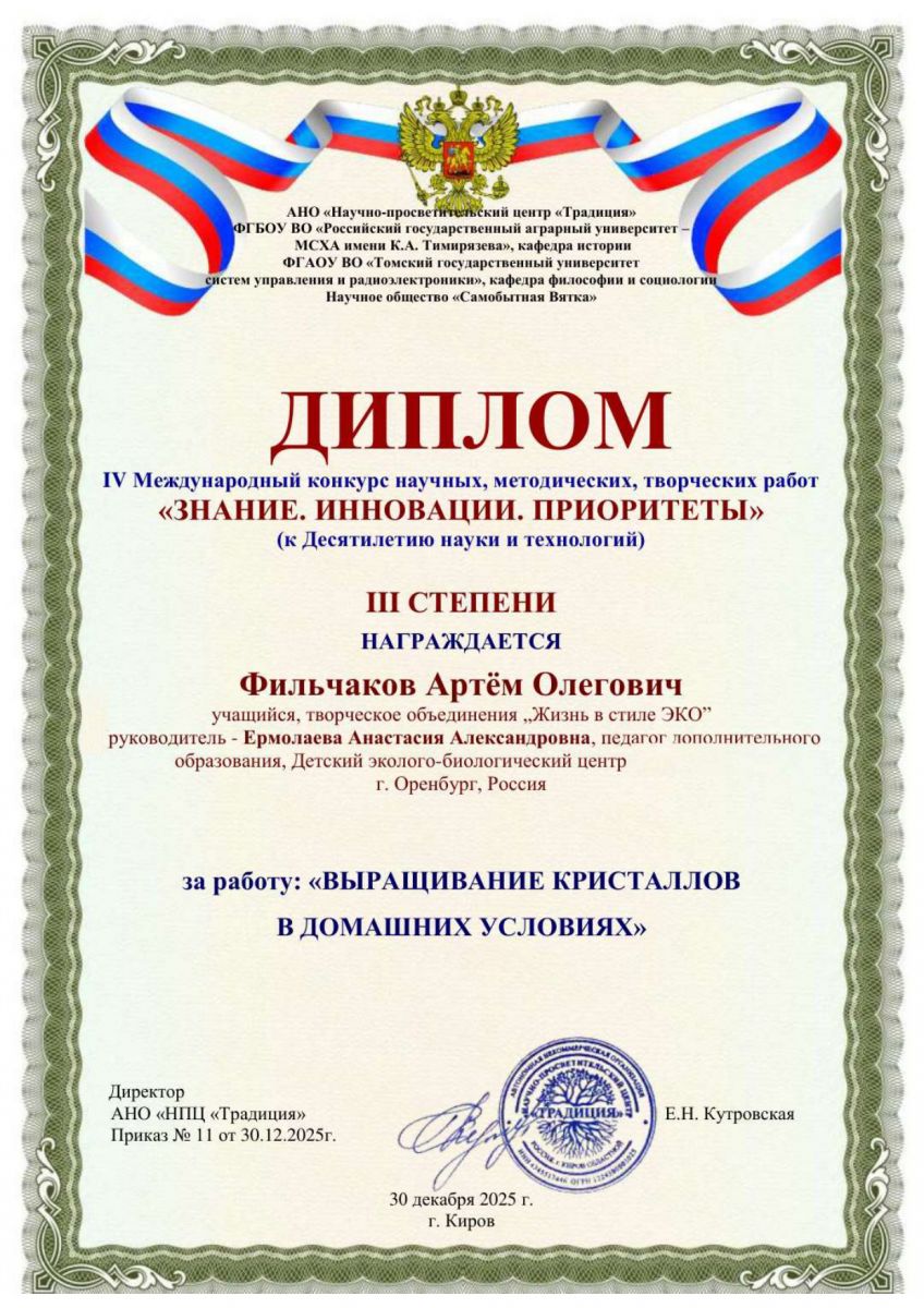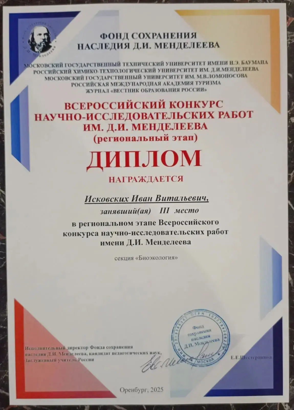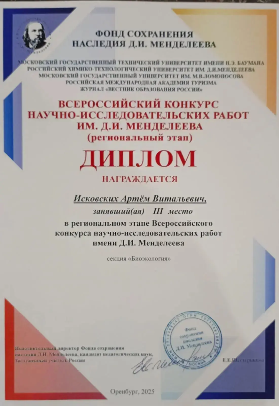 Региональный этап конкурса научно-исследовательских работ Имени Д.М. Менделеева. Иван и Артём участники творческого объединения «Экопрофи»Детского экологов-биологического центра и ОГУ. Секция"Биоэкология». Поздравляем с заслуженными наградами!