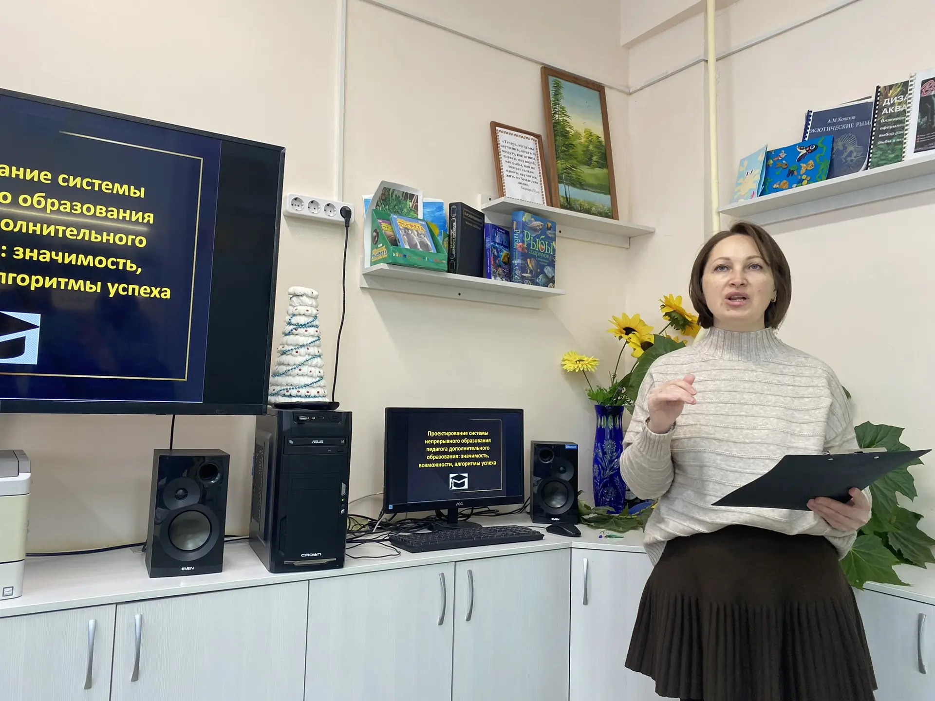 Заместитель директора по научно-методической работе Краснова Татьяна Александровна и Нечаев Александр Витальевич поделились своим опытом работы по теме «Развитие профессиональных компетенций педагогического коллектива посредством реализации цифровых образовательных технологий и инновационных форм организации работы». Продемонстрирована работа интерактивной доски и платформы Орен-био в образовательном процессе Детского эколого-биологического центра.